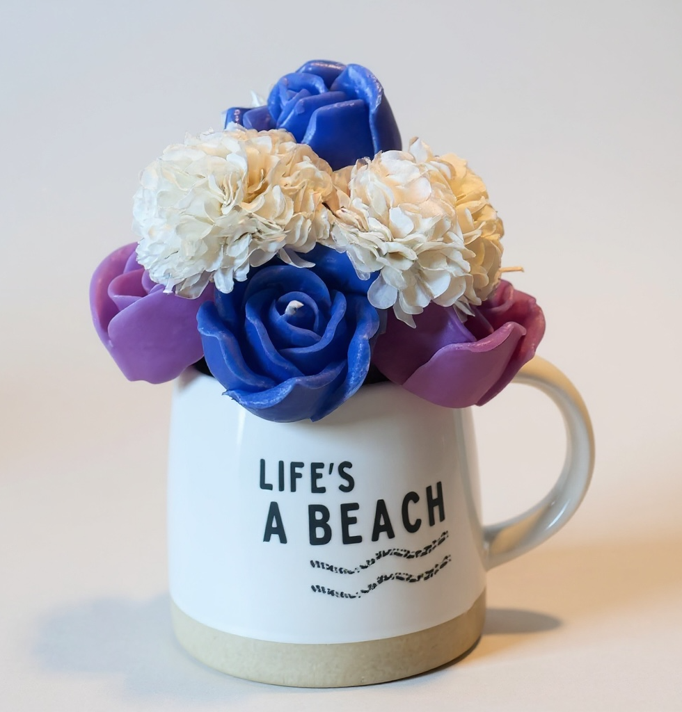 Unique beach lover gift! Handcrafted beeswax flower-shaped wax melts in a "Life's a Beach" ceramic mug. Perfect coastal décor for beach house enthusiasts or ocean themed gifts for women. Each artisan-made flower melt is hand-poured from natural beeswax - clean-burning, non-toxic, and long-lasting fragrance. Trending coastal farmhouse aesthetic meets functional home fragrance. Melt the flowers for beautiful beach vibes, then reuse the mug! Ideal for beach birthday gifts, summer hostess presents, or beachy home décor. Ships free!
