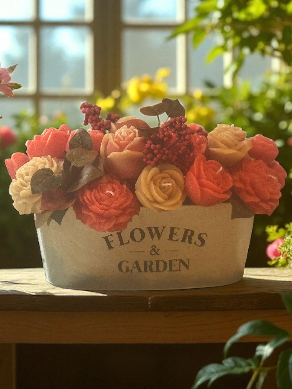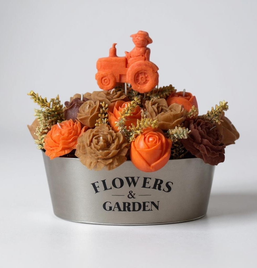 This Golden Acre autumn centerpiece is an impeccable combo of autumn-colored candle flowers, soft fall fragrance, and a vintage-style metal tin labeled ‘Flowers & Garden' that instantly adds the richness of harvest time.